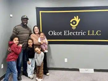 After completing electrical school and gaining hands-on experience, Philips moved to the United States. He worked full-time as an electrician, took side jobs, cleaned offices on weekends, and saved carefully to support his growing family. In 2023, he founded Okot Electric with a simple belief: